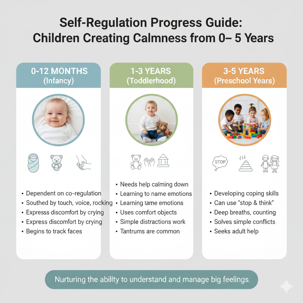 Self-regulation is how one can control emotions, behavior, and impulses, and the development of it starts from the first few days of life. Caregivers regulate babies for them, but they develop calm strategies, learn emotional words, and establish routines to deal with frustration over time.